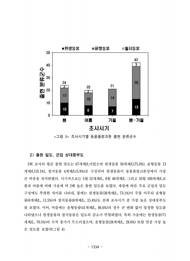 1334 그림 3 조사시기별 동물플랑크톤 출현 분류군수 2 출현 밀도, 군집 상대풍부도 3회 조사의 평균 출현 밀도는 67개체/L이었으며 원생동물 50개체/L 75.0% , 윤형동물 13 개체/L 19.1% , 절지동물 4개체/L 5.9% 로 구성되어 원생동물이 동물플랑크톤상에서 가장 큰 비중을 차지하였다. 시기적으로는 5월 52개체/L, 8월 48개체/L 그리고 10월 100개체/L로 봄과 여름에 비해 가을에 약 2배 높은 출현 밀도를 보였다. 계절에 따른 주요 군집의 밀도 구성에도 뚜렷한 차이를 나타내, 봄에는 원생동물 38개체/L, 73.1% 이 주를 이루되 윤형동 물 6개체/L, 11.5% 과 절지동물 8개체/L, 15.4% 도 전체 조사시기 중 가장 높은 상대풍부도 를 보였다. 이어, 여름에는 윤형...