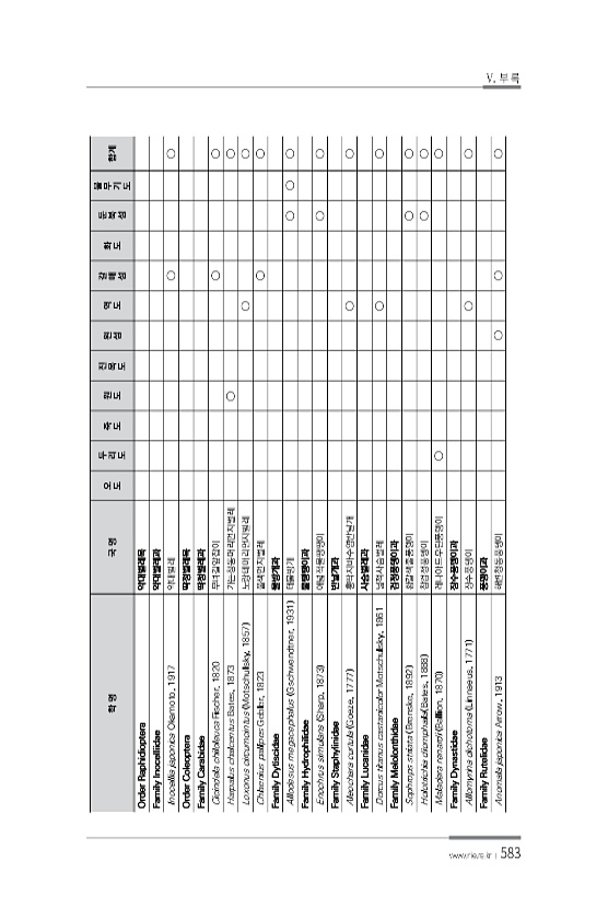 583 학 명 국 명 오 도 두리도 죽도 원도 진목도 왼섬 역도 갈매섬 화도 둔북섬 불무기도 합계 Order Raphidioptera 약대벌레목 Family Inocelliidae 약대벌레과 Inocellia japonica Okamoto, 1917 약대벌레 ? ? Order Coleoptera 딱정벌레목 Family Carabidae 딱정벌레과 Cicindela chiloleuca Fischer, 1820 무녀길앞잡이 ? ? Harpalus chalcentus Bates, 1873 가는청동머리먼지벌레 ? ? Loxonus circumcintus Motschulsky, 1857 노랑테머리먼지벌레 ? ? Chlaenius pallipes Gebler, 1823 풀색먼지벌레 ? ? Family Dytiscida...