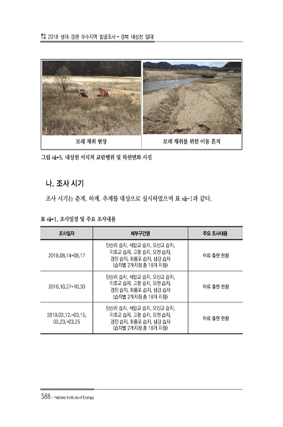 2018 생태·경관 우수지역 발굴조사 경북 내성천 일대 588 ? National Institute of Ecology 모래 채취 현장 모래 채취를 위한 이동 흔적 그림 ⅷ-5. 내성천 서식처 교란행위 및 하천변화 사진 조사 시기는 춘계, 하계, 추계를 대상으로 실시하였으며 표 ⅷ-1과 같다. 조사일자 세부구간명 주요 조사내용 2018.08.1408.17 탄산리 습지, 석탑교 습지, 오신교 습지, 미호교 습지, 고평 습지, 오천 습지, 경진 습지, 회룡포 습지, 삼강 습지 습지별 2개지점 총 18개 지점 어류 출현 현황 2018.10.2710.30 탄산리 습지, 석탑교 습지, 오신교 습지, 미호교 습지, 고평 습지, 오천 습지, 경진 습지, 회룡포 습지, 삼강 습지 습지별 2개지점 총 18개 지점 어류 출현...