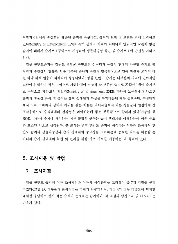 586 지방자치단체를 중심으로 훼손된 습지를 복원하고, 습지의 보전 및 보호를 위해 노력하고 있다 Ministry of Environment, 1999 특히 생태적 가치가 뛰어나며 인위적인 교란이 없는 습지에 대해서 습지보호구역으로 지정하여 생물다양성 증진 및 습지보호에 만전을 기하고 있다. 영월 한반도습지는 강원도 영월군 한반도면 신천리와 옹정리 일대의 하천형 습지로 평 청강과 주천강이 합류한 이후 하폭이 좁아져 하천의 병목현상으로 인해 자갈과 모래의 하 천 바닥 위에 뻘층이 퇴적되어 형성되었다. 영월 한반도 습지는 대부분의 지역에 인위적인 교란이나 훼손이 적은 지역으로 자연환경이 비교적 잘 보존된 습지로 2012년 1월에 습지보 호 구역으로 지정?고시 되었다 Ministry of Environment, ...