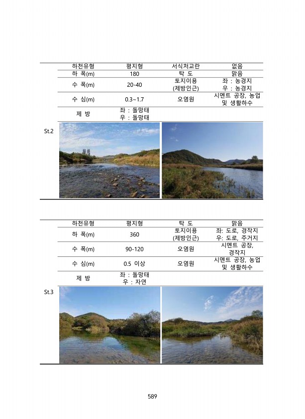589 St.2 하천유형 평지형 서식처교란 없음 하 폭 m 180 탁 도 맑음 수 폭 m 20-40 토지이용 제방인근 좌 농경지 우 농경지 수 심 m 0.3∼1.7 오염원 시멘트 공장, 농업 및 생활하수 제 방 좌 돌망태 우 돌망태 St.3 하천유형 평지형 탁 도 맑음 하 폭 m 360 토지이용 제방인근 좌도로, 경작지 우도로, 주거지 수 폭 m 90-120 오염원 시멘트 공장, 경작지 수 심 m 0.5 이상 오염원 시멘트 공장, 농업 및 생활하수 제 방 좌 돌망태 우 자연