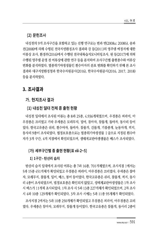 viii. 어 류 www.nie.re.kr ?591 2 내성천의 9개 조사구간을 포함하고 있는 선행 연구로는 변과 변 2008a; 2008b , 송과 전 2008 에 의해 수행된 전국자연환경조사 결과와 강 등 2011 의 영주댐 예정지에 대한 어류상 조사, 환경부 2016 에서 수행된 전국내륙습지모니터링조사, 원 등 2017 에 의해 수행된 영주댐 운영 전 어류상에 관한 연구 등을 분석하여 조사구간별 출현종수와 어류상 변화를 분석하였다. 멸종위기야생생물인 흰수마자의 분포 변화를 확인하기 위해 본 조사 결과와 대구지방환경청과 한국수자원공사 2016 , 한국수자원공사 2016, 2017, 2018 등을 분석하였다. 3. 1 내성천 일대에서 조사된 어류는 총 8과 25종, 4,936개체였으며, 우점종은 피라미, ...
