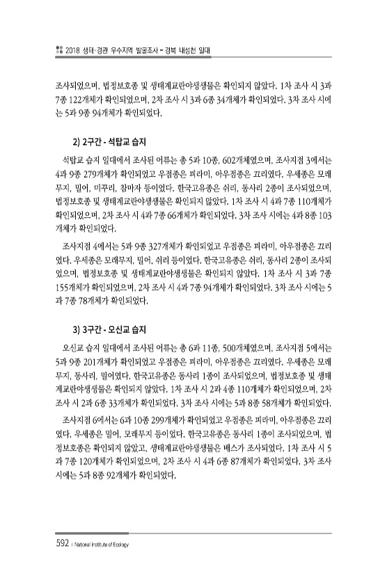 2018 생태·경관 우수지역 발굴조사 경북 내성천 일대 592 ? National Institute of Ecology 조사되었으며, 법정보호종 및 생태계교란야생생물은 확인되지 않았다. 1차 조사 시 3과 7종 122개체가 확인되었으며, 2차 조사 시 3과 6종 34개체가 확인되었다. 3차 조사 시에 는 5과 9종 94개체가 확인되었다. 2 2 석탑교 습지 일대에서 조사된 어류는 총 5과 10종, 602개체였으며, 조사지점 3에서는 4과 9종 279개체가 확인되었고 우점종은 피라미, 아우점종은 끄리였다. 우세종은 모래 무지, 밀어, 미꾸리, 참마자 등이었다. 한국고유종은 쉬리, 동사리 2종이 조사되었으며, 법정보호종 및 생태계교란야생생물은 확인되지 않았다. 1차 조사 시 4과 7종 110개체가 확인되었으며,...