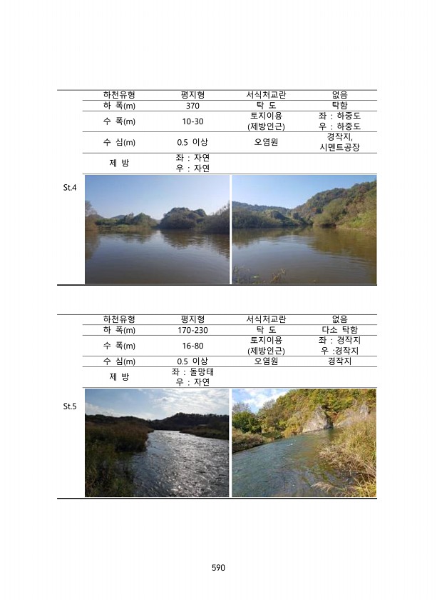 590 St.4 하천유형 평지형 서식처교란 없음 하 폭 m 370 탁 도 탁함 수 폭 m 10-30 토지이용 제방인근 좌 하중도 우 하중도 수 심 m 0.5 이상 오염원 경작지, 시멘트공장 제 방 좌 자연 우 자연 St.5 하천유형 평지형 서식처교란 없음 하 폭 m 170-230 탁 도 다소 탁함 수 폭 m 16-80 토지이용 제방인근 좌 경작지 우 경작지 수 심 m 0.5 이상 오염원 경작지 제 방 좌 돌망태 우 자연
