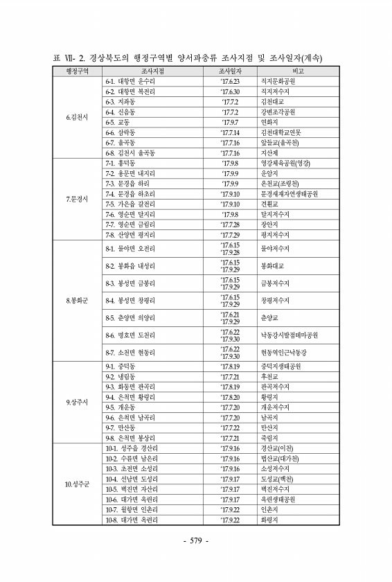 표 Ⅶ- 2. 경상북도의 행정구역별 양서파충류 조사지점 및 조사일자 계속 행정구역 조사지점 조사일자 비고 6.김천시 6-1. 대항면 운수리 ‘17.6.23 직지문화공원 6-2. 대항면 복전리 ‘17.6.30 직지저수지 6-3. 지좌동 ‘17.7.2 김천대교 6-4. 신음동 ‘17.7.2 강변조각공원 6-5. 교동 ‘17.9.7 연화지 6-6. 삼락동 ‘17.7.14 김천대학교연못 6-7. 율곡동 ‘17.7.16 앞들교 율곡천 6-8. 김천시 율곡동 ‘17.7.16 지산제 7.문경시 7-1. 흥덕동 ‘17.9.8 영강체육공원 영강 7-2. 용문면 내지리 ‘17.9.9 운암지 7-3. 문경읍 하리 ‘17.9.9 온천교 조령천 7-4. 문경읍 하초리 ‘17.9.10 문경새재자연생태공원 7-5. 가은읍 갈전리 ‘1...