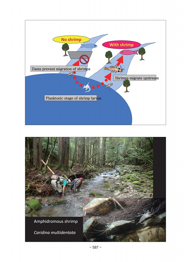 Amphidromous shrimp Caridina multidentata Shrimps migrate upstream Planktonic stage of shrimp larvae Dams prevent migration of shrimps With shrimp No shrimp 587