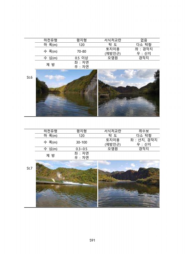 591 St.6 하천유형 평지형 서식처교란 없음 하 폭 m 120 탁 도 다소 탁함 수 폭 m 70-80 토지이용 제방인근 좌 경작지 우 산지 수 심 m 0.5 이상 오염원 경작지 제 방 좌 자연 우 자연 St.7 하천유형 평지형 서식처교란 취수보 하 폭 m 120 탁 도 다소 탁함 수 폭 m 30-100 토지이용 제방인근 좌 산지, 경작지 우 산지 수 심 m 0.3∼0.5 오염원 경작지 제 방 좌 자연 우 자연
