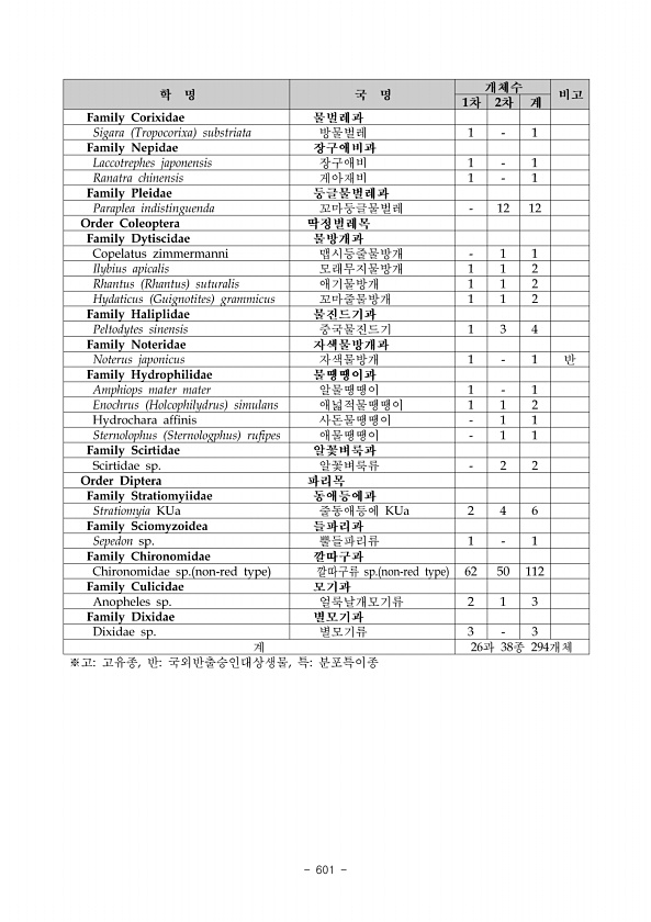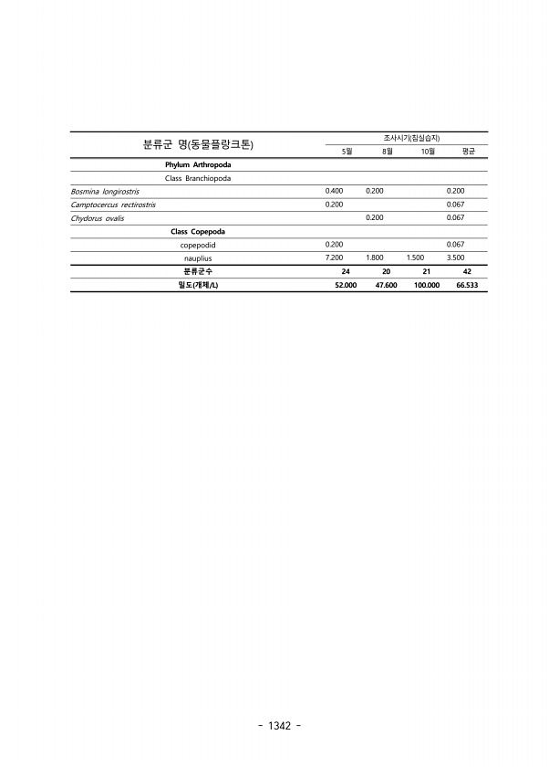 1342 분류군 명 동물플랑크톤 조사시기 침실습지 5월 8월 10월 평균 Phylum Arthropoda Class Branchiopoda Bosmina longirostris 0.400 0.200 0.200 Camptocercus rectirostris 0.200 0.067 Chydorus ovalis 0.200 0.067 Class Copepoda copepodid 0.200 0.067 nauplius 7.200 1.800 1.500 3.500 분류군수 24 20 21 42 밀도 개체/L 52.000 47.600 100.00066.533