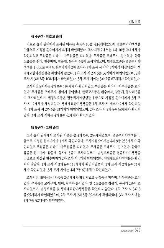 viii. 어 류 www.nie.re.kr ?593 4 4 미호교 습지 일대에서 조사된 어류는 총 4과 10종, 434개체였으며, 멸종위기야생생물 Ⅰ급으로 지정된 흰수마자가 4개체 확인되었다. 조사지점 7에서는 4과 10종 241개체가 확인되었고 우점종은 피라미, 아우점종은 끄리였다. 우세종은 모래무지, 밀어였다. 한국 고유종은 쉬리, 흰수마자, 참몰개, 동사리 4종이 조사되었으며, 법정보호종은 멸종위기야 생생물 Ⅰ급으로 지정된 흰수마자가 2차 조사와 3차 조사 시 각각 1개체씩 채집되었다. 생 태계교란야생생물은 확인되지 않았다. 1차 조사 시 2과 6종 66개체가 확인되었으며, 2차 조사 시 3과 8종 108개체가 확인되었다. 3차 조사 시에는 3과 7종 67개체가 확인되었다. 조사지점 8에서는 4과 9종...