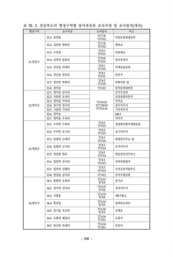 표 Ⅶ- 2. 경상북도의 행정구역별 양서파충류 조사지점 및 조사일자 계속 행정구역 조사지점 조사일자 비고 11.안동시 11-1. 송천동 ‘17.7.31 ‘17.9.12 안동농업생태공원 11-2. 길안면 현하리 ‘17.7.31 ‘17.9.12 현하교 11-3. 수상동 ‘17.8.1 ‘17.9.11 안동대교 11-4. 남후면 광음리 ‘17.8.01 ‘17.9.11 암산유원지 11-5. 풍산읍 마애리 ‘17.8.1 ‘17.9.11 마애솔숲공원 11-6. 풍산읍 만운리 ‘17.8.1 ‘17.9.11 만운지 11-7. 풍천면 하회리 ‘17.8.2 ‘17.9.10 하회마을 앞 11-8. 상아동 ‘17.10.2 동악골생태연못 12.영덕군 12-1. 영덕읍 남석리 ‘17.5.9-13 ‘17.7.29-8.5 ‘17.9.11...