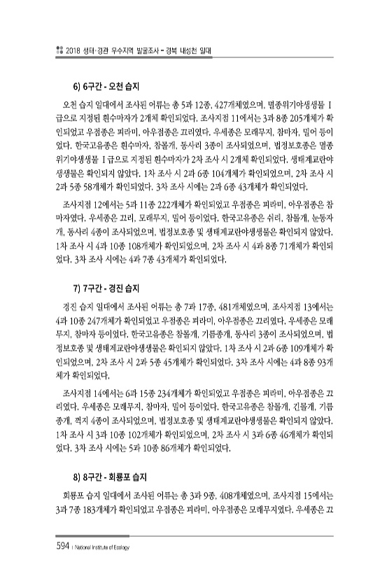 2018 생태·경관 우수지역 발굴조사 경북 내성천 일대 594 ? National Institute of Ecology 6 오천 습지 일대에서 조사된 어류는 총 5과 12종, 427개체였으며, 멸종위기야생생물 Ⅰ 급으로 지정된 흰수마자가 2개체 확인되었다. 조사지점 11에서는 3과 8종 205개체가 확 인되었고 우점종은 피라미, 아우점종은 끄리였다. 우세종은 모래무지, 참마자, 밀어 등이 었다. 한국고유종은 흰수마자, 참몰개, 동사리 3종이 조사되었으며, 법정보호종은 멸종 위기야생생물 Ⅰ급으로 지정된 흰수마자가 2차 조사 시 2개체 확인되었다. 생태계교란야 생생물은 확인되지 않았다. 1차 조사 시 2과 6종 104개체가 확인되었으며, 2차 조사 시 2과 5종 58개체가 확인되었다. 3차 조사 시에는 2과 6...