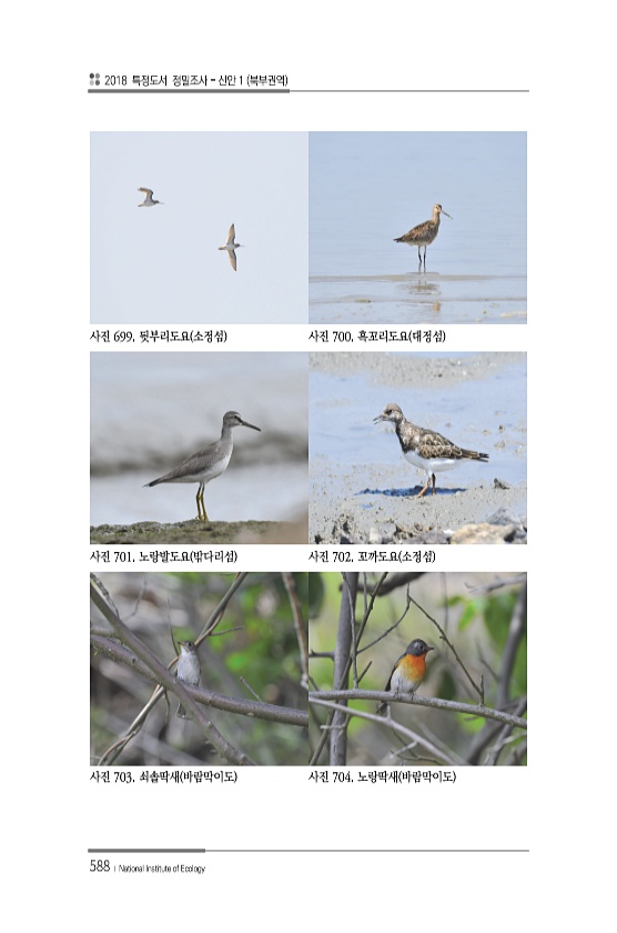 2018 특정도서 정밀조사 신안 1 북부권역 588 ? National Institute of Ecology 사진 699. 뒷부리도요 소정섬 사진 700. 흑꼬리도요 대정섬 사진 701. 노랑발도요 밖다리섬 사진 702. 꼬까도요 소정섬 사진 703. 쇠솔딱새 바람막이도 사진 704. 노랑딱새 바람막이도