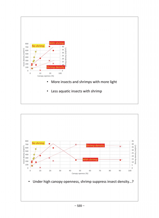 No shrimp With shrimp Shrimp density ? Under high canopy openness, shrimp suppress insect density…? No shrimp With shrimp Shrimp density ? More insects and shrimps with more light ? Less aquatic insects with shrimp 589
