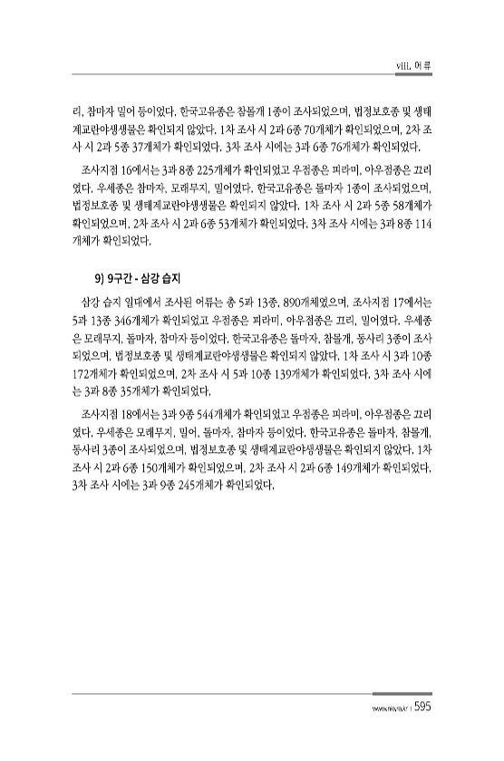 viii. 어 류 www.nie.re.kr ?595 리, 참마자 밀어 등이었다. 한국고유종은 참몰개 1종이 조사되었으며, 법정보호종 및 생태 계교란야생생물은 확인되지 않았다. 1차 조사 시 2과 6종 70개체가 확인되었으며, 2차 조 사 시 2과 5종 37개체가 확인되었다. 3차 조사 시에는 3과 6종 76개체가 확인되었다. 조사지점 16에서는 3과 8종 225개체가 확인되었고 우점종은 피라미, 아우점종은 끄리 였다. 우세종은 참마자, 모래무지, 밀어였다. 한국고유종은 돌마자 1종이 조사되었으며, 법정보호종 및 생태계교란야생생물은 확인되지 않았다. 1차 조사 시 2과 5종 58개체가 확인되었으며, 2차 조사 시 2과 6종 53개체가 확인되었다. 3차 조사 시에는 3과 8종 114 개체가 확인되었다. 9 삼강...