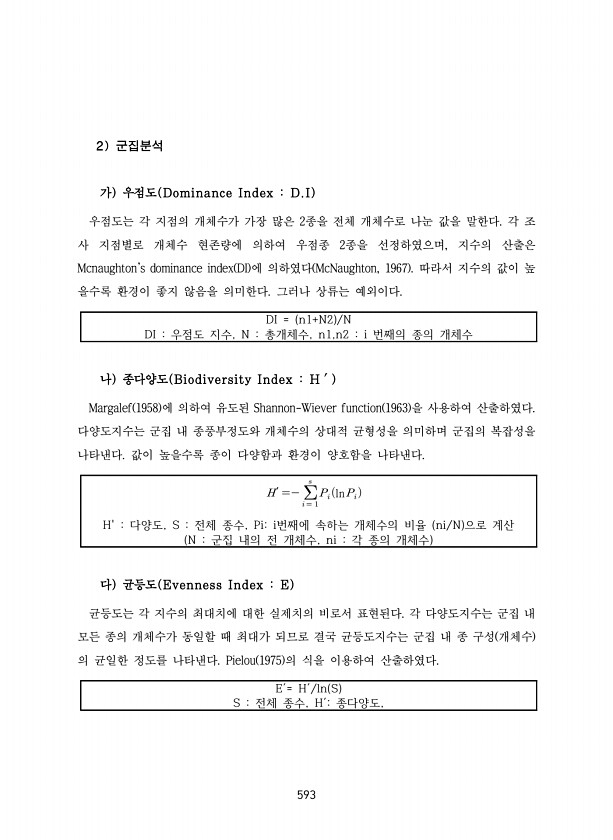 593 2 군집분석 가 우점도 Dominance Index D.I 우점도는 각 지점의 개체수가 가장 많은 2종을 전체 개체수로 나눈 값을 말한다. 각 조 사 지점별로 개체수 현존량에 의하여 우점종 2종을 선정하였으며, 지수의 산출은 Mcnaughtons dominance index DI 에 의하였다 McNaughton, 1967 따라서 지수의 값이 높 을수록 환경이 좋지 않음을 의미한다. 그러나 상류는 예외이다. DI = n1+N2 /N DI 우점도 지수, N 총개체수, n1,n2 i 번째의 종의 개체수 나 종다양도 Biodiversity Index H′ Margalef 1958 에 의하여 유도된 Shannon-Wiever function 1963 을 사용하여 산출하였다. 다양도지수는 군집 내 종풍부정도와 ...