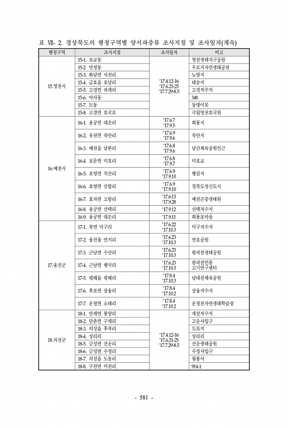 표 Ⅶ- 2. 경상북도의 행정구역별 양서파충류 조사지점 및 조사일자 계속 행정구역 조사지점 조사일자 비고 15.영천시 15-1. 조교동 ‘17.4.12-16 ‘17.6.21-25 ‘17.7.29-8.5 영천생태지구공원 15-2. 만정동 우로지자연생태공원 15-3. 화남면 사천리 노방지 15-4. 금호읍 호남리 대승지 15-5. 고경면 파계리 고경저수지 15-6. 야사동 348 15-7. 도동 동댕이못 15-8. 고경면 호국로 국립영천호국원 16.예천시 16-1. 용궁면 대은리 ‘17.6.7 ‘17.9.5 회룡지 16-2. 유천면 죽안리 ‘17.6.9 ‘17.9.6 죽안지 16-3. 예천읍 남본리 ‘17.6.8 ‘17.9.6 남산체육공원인근 16-4. 보문면 미호리 ‘17.6.8 ‘17.9.7 미호교 16-5...