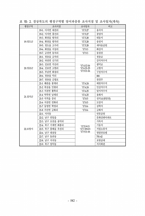 표 Ⅶ- 2. 경상북도의 행정구역별 양서파충류 조사지점 및 조사일자 계속 행정구역 조사지점 조사일자 비고 19.청도군 19-1. 이서면 대전리 ‘17.5.27 용곡지 19-2. 이서면 흥선리 ‘17.5.27 풍양지 19-3. 화양읍 범곡리 ‘17.5.28 대동지 19-4. 화양읍 범곡리 ‘17.5.28 송전지 19-5. 청도읍 고수리 ‘17.5.28 새마을공원 19-6. 화양읍 서상리 ‘17.9.3 화강지 19-7. 금천면 동곡리 ‘17.9.3 동장천 20.청송군 20-1. 청송읍 금곡리 ‘17.4.12-16 ‘17.6.21-25 ‘17.9.11-16 청송교 20-2. 파천면 신기리 감곡저수지 20-3. 진보면 각산리 광덕교 20-4. 진보면 고현리 고현지 20-5. 부남면 화장리 구천저수지 20-6. 청송...