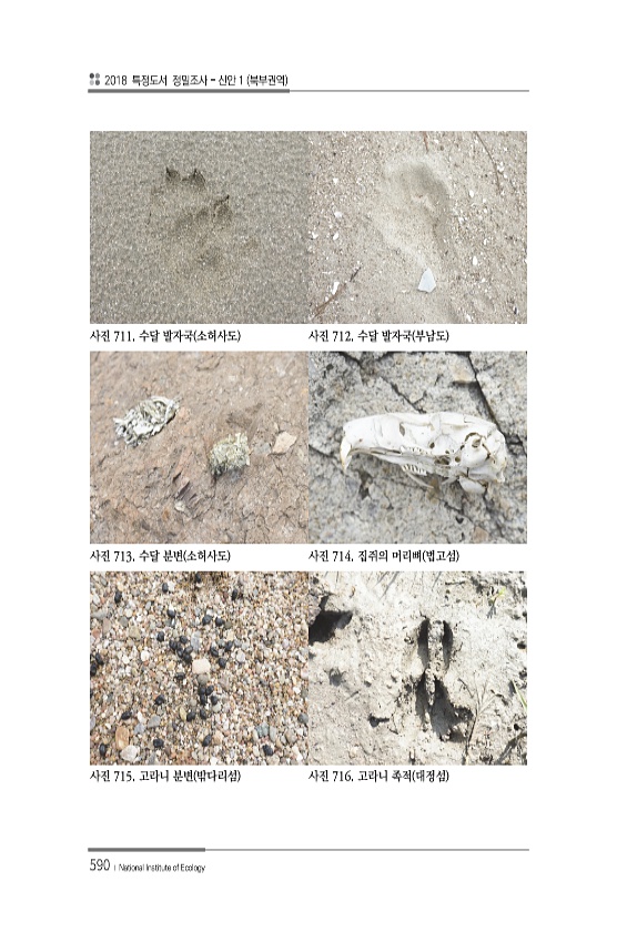 2018 특정도서 정밀조사 신안 1 북부권역 590 ? National Institute of Ecology 사진 711. 수달 발자국 소허사도 사진 712. 수달 발자국 부남도 사진 713. 수달 분변 소허사도 사진 714. 집쥐의 머리뼈 법고섬 사진 715. 고라니 분변 밖다리섬 사진 716. 고라니 족적 대정섬