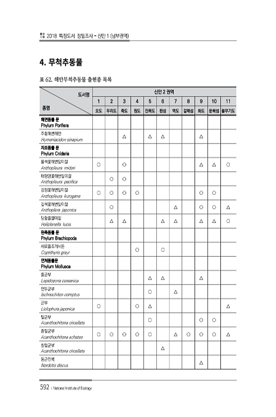 2018 특정도서 정밀조사 신안 1 남부권역 592 ? National Institute of Ecology 4. 도서명 종명 신안 2 권역 1 2 3 4 5 6 7 8 9 10 11 오도 두리도 죽도 원도 진목도 왼섬 역도 갈매섬 화도 둔북섬 불무기도 해면동물 문 Phylum Porifera 주황해변해면 Hymeniacidon sinapium △ △ △ △ 자포동물 문 Phylum Cnidaria 풀색꽃해변말미잘 Anthopleura midori ○ ○ △ △ ○ 태평양꽃해변말미잘 Anthopleura pacifica ○ ○ 검정꽃해변말미잘 Anthopleura kurogane ○ ○ ○ ○ ○ ○ 갈색꽃해변말미잘 Anthoplera japonica ○ △ ○ ○ △ 담황줄말미잘 Haliplanella l...