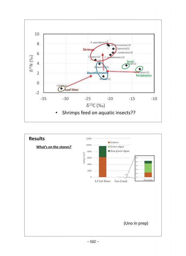 Results What’s on the stones? Uno in prep Shrimps Aquatic insects Periphyton Leaf litter Snail ? Shrimps feed on aquatic insects?? 592