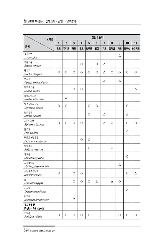 2018 특정도서 정밀조사 신안 1 남부권역 594 ? National Institute of Ecology 도서명 종명 신안 2 권역 1 2 3 4 5 6 7 8 9 10 11 오도 두리도 죽도 원도 진목도 왼섬 역도 갈매섬 화도 둔북섬 불무기도 갯우렁이 Lunaria gilva △ 피뿔고둥 Rapana venosa ○ ○ △ 대수리 Reidhia clavigera ○ ○ ○ ○ ○ ○ △ ○ ○ ○ ○ 맵사리 Ceratostoma rorifluum △ △ 두드럭고둥 Reishia bronni ○ ○ △ 뿔두드럭고둥 Reishia luteostona △ 털껍질돼지고둥 Cantharus cecillei ○ ○ ○ ○ ○ 보리무륵 Mitrella bicincta ○ △ △ 고랑딱개비 Siphonaria jap...