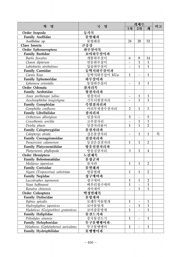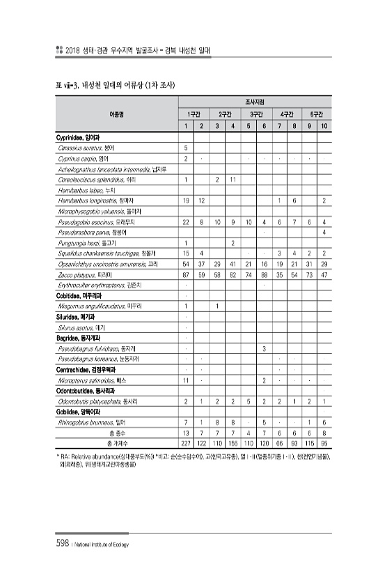 2018 생태·경관 우수지역 발굴조사 경북 내성천 일대 598 ? National Institute of Ecology 어종명 조사지점 1구간 2구간 3구간 4구간 5구간 1 2 3 4 5 6 7 8 9 10 Cyprinidae, 잉어과 Carassius auratus, 붕어 5 Cyprinus carpio, 잉어 2 Acheilognathus lanceolata intermedia, 납자루 Coreoleuciscus splendidus, 쉬리 1 2 11 Hemibarbus labeo, 누치 Hemibarbus longirostris, 참마자 19 12 1 6 2 Microphysogobio yaluensis, 돌마자 Pseudogobio esocinus, 모래무지 22 8 10 ...