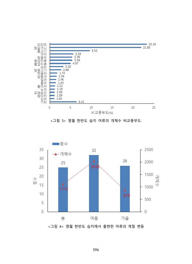 596 그림 3 영월 한반도 습지 어류의 개체수 비교풍부도. 그림 4 영월 한반도 습지에서 출현한 어류의 계절변동
