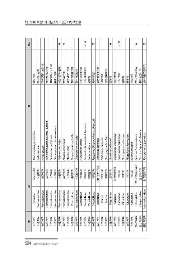 594 목 과 종 비고 노린재목 Cydnidae 땅노린재과 Macroscytus japonensis 땅노린재 노린재목 Pentatomidae 노린재과 Aelia fieberi 메추리노린재 노린재목 Pentatomidae 노린재과 Arma custos 갈색주둥이노린재 노린재목 Pentatomidae 노린재과 Eurydema gebleri subsp. gebleri 북쪽비단노린재 노린재목 Pentatomidae 노린재과 Eysarcoris guttigerus 점박이둥글노린재 노린재목 Pentatomidae 노린재과 Graphosoma rubrolinneatum 홍줄노린재 노린재목 Pentatomidae 노린재과 Halyomorha halys 썩덩나무노린재 특 노린재목 Pentatomidae 노린재과 Nezar...