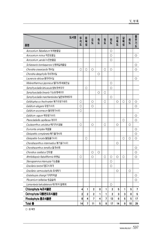 V. 부 록 www.nie.re.kr ?597 도서명 종명 두리도 둔북섬 오도 죽도 원도 왼도 진목도 갈매섬 화도 불무기도 Acrosorium flabellatum 부채분홍잎 ○ Acrosorium minus 작은분홍잎 ○ ○ Acrosorium yendoi 누은분홍잎 ○ Schizoseris bombayensis 난쟁이갈래줄잎 ○ Chondria crassicaulis 개서실 ○ ○ ○ ○ ○ ○ Chondria dasyphylla 각시개서실 ○ Laurencia obtusa 몽우리서실 ○ Melanothamnus japonicus 떨기나무새붉은실 ○ Symphyocladia latiuscula 참보라색우무 ○ ○ Symphyocladia linearis 가는보라색우무 ○ ○ Symphyocladia ma...