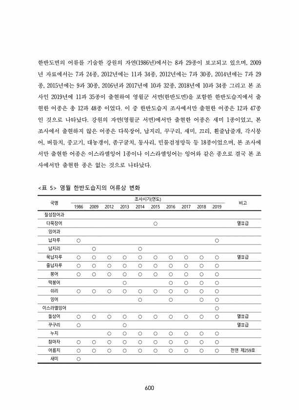 600 한반도면의 어류를 기술한 강원의 자연 1986년 에서는 8과 29종이 보고되고 있으며, 2009 년 자료에서는 7과 24종, 2012년에는 11과 34종, 2012년에는 7과 30종, 2014년에는 7과 29 종, 2015년에는 9과 30종, 2016년과 2017년에 10과 32종, 2018년에 10과 34종 그리고 본 조 사인 2019년에 11과 35종이 출현하여 영월군 서면 한반도면 을 포함한 한반도습지에서 출 현한 어종은 총 12과 48종 이었다. 이 중 한반도습지 조사에서만 출현한 어종은 12과 47종 인 것으로 나타났다. 강원의 자연 영월군 서면 에서만 출현한 어종은 새미 1종이었고, 본 조사에서 출현하지 않은 어종은 다묵장어, 납지리, 꾸구리, 새미, 끄리, 흰줄납줄개, 각시붕 어, 버들치...