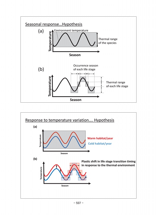 Warm habitat/year Cold habitat/year Season Temperature a Season Temperature b Plastic shift in life stage transition timing in response to the thermal environment Response to temperature variation…. Hypothesis a Temperature Season Thermal range of the species Thermal range of each life stage Occurrence season of each life stage Season Temperature b Environment temperature Seasonal response…Hypothe...