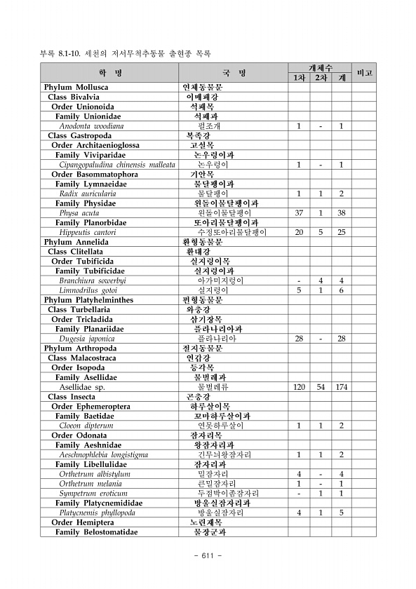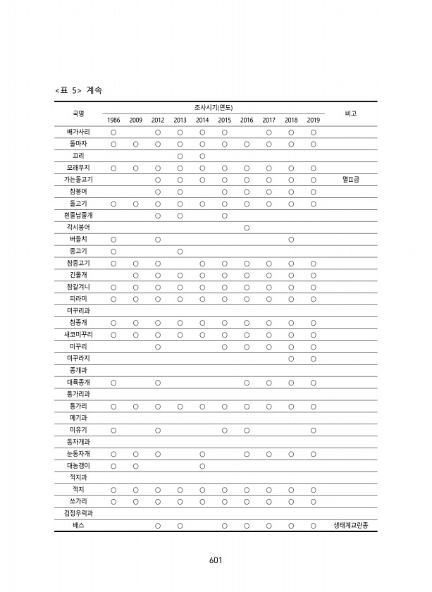 601 국명 조사시기 연도 비고 1986 2009 2012 2013 2014 2015 2016 2017 2018 2019 배가사리 ○ ○ ○ ○ ○ ○ ○ ○ 돌마자 ○ ○ ○ ○ ○ ○ ○ ○ ○ ○ 끄리 ○ ○ 모래무지 ○ ○ ○ ○ ○ ○ ○ ○ ○ ○ 가는돌고기 ○ ○ ○ ○ ○ ○ ○ ○ 멸Ⅱ급 참붕어 ○ ○ ○ ○ ○ ○ ○ 돌고기 ○ ○ ○ ○ ○ ○ ○ ○ ○ ○ 흰줄납줄개 ○ ○ ○ 각시붕어 ○ 버들치 ○ ○ ○ 중고기 ○ ○ 참중고기 ○ ○ ○ ○ ○ ○ ○ ○ ○ 긴몰개 ○ ○ ○ ○ ○ ○ ○ ○ ○ 참갈겨니 ○ ○ ○ ○ ○ ○ ○ ○ ○ ○ 피라미 ○ ○ ○ ○ ○ ○ ○ ○ ○ ○ 미꾸리과 참종개 ○ ○ ○ ○ ○ ○ ○ ○ ○ ○ 새코미꾸리 ○ ○ ○ ○ ○ ○ ○ ○ ○ ○ 미...
