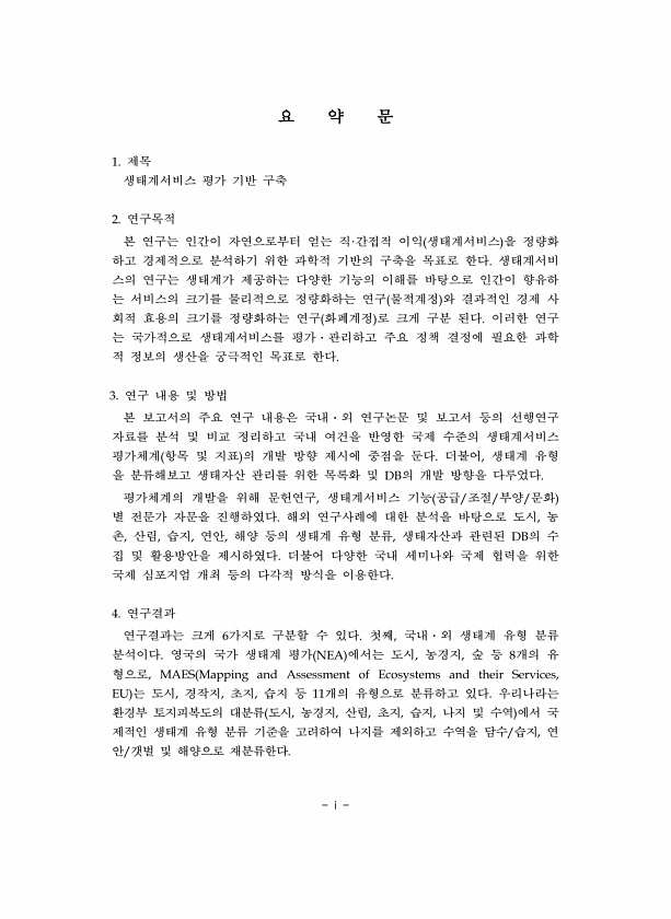 i 요 약 문 제목 생태계서비스 평가 기반 구축 연구목적 본 연구는 인간이 자연으로부터 얻는 직 간접적 이익 생태계서비스 을 정량화 하고 경제적으로 분석하기 위한 과학적 기반의 구축을 목표로 한다 생태계서비 스의 연구는 생태계가 제공하는 다양한 기능의 이해를 바탕으로 인간이 향유하 는 서비스의 크기를 물리적으로 정량화하는 연구 물적계정 와 결과적인 경제 사 회적 효용의 크기를 정량화하는 연구 화폐계정 로 크게 구분 된다 이러한 연구 는 국가적으로 생태계서비스를 평가 관리하고 주요 정책 결정에 필요한 과학 적 정보의 생산을 궁극적인 목표로 한다 연구 내용 및 방법 본 보고서의 주요 연구 내용은 국내 외 연구논문 및 보고서 등의 선행연구 자료를 분석 및 비교 정리하고 국내 여건을 반영한 국제 수준의 생태계서비스...