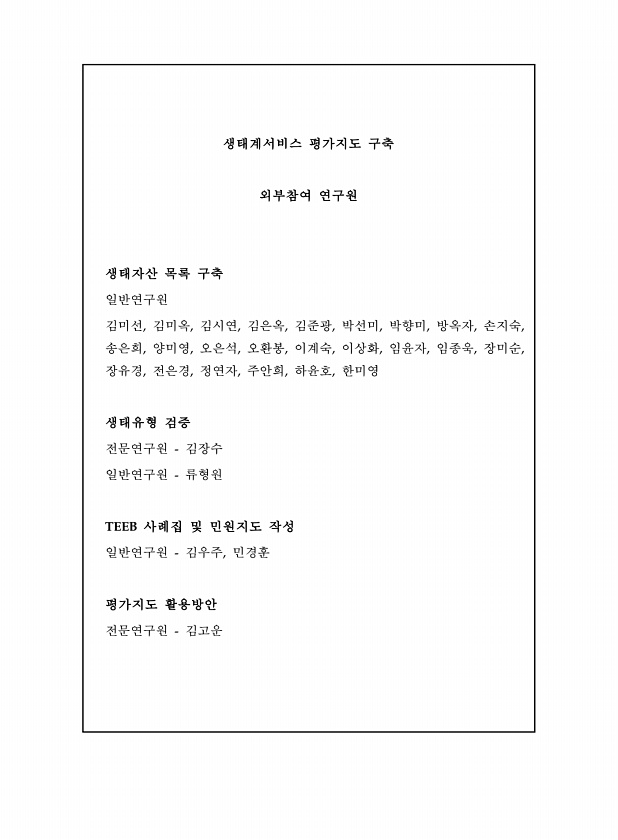 생태계서비스 평가지도 구축 외부참여 연구원 생태자산 목록 구축 일반연구원 김미선, 김미옥, 김시연, 김은옥, 김준광, 박선미, 박향미, 방옥자, 손지숙, 송은희, 양미영, 오은석, 오환봉, 이계숙, 이상화, 임윤자, 임종욱, 장미순, 장유경, 전은경, 정연자, 주안희, 하윤호, 한미영 생태유형 검증 전문연구원 김장수 일반연구원 류형원 TEEB 사례집 및 민원지도 작성 일반연구원 김우주, 민경훈 평가지도 활용방안 전문연구원김고운