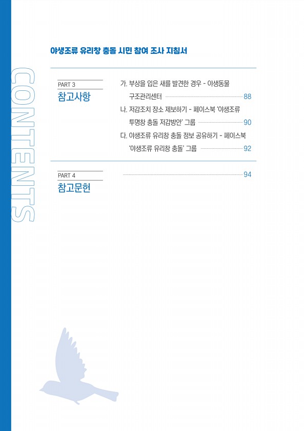 야생조류 유리창 충돌 시민 참여 조사 지침서 CONTENTS 가. 부상을 입은 새를 발견한 경우 ? 야생동물 구조관리센터 ………………………………………………………………………………………88 나. 저감조치 장소 제보하기 페이스북 ‘야생조류 투명창 충돌 저감방안’ 그룹 …………………………………………………90 다. 야생조류 유리창 충돌 정보 공유하기 페이스북 ‘야생조류 유리창 충돌’ 그룹 ………………………………………………92 ………………………………………………………………………………………………………………………………………94 PART 3 참고사항 PART 4참고문헌