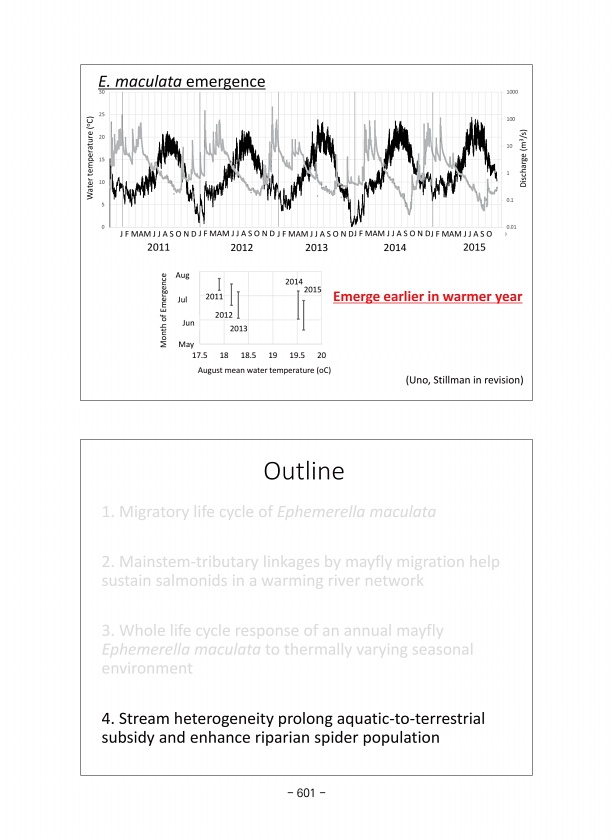 Outline 1. Migratory life cycle of Ephemerella maculata 2. Mainstem-tributary linkages by mayfly migration help sustain salmonids in a warming river network 3. Whole life cycle response of an annual mayfly Ephemerella maculata to thermally varying seasonal environment 4. Stream heterogeneity prolong aquatic-to-terrestrial subsidy and enhance riparian spider population 2011 2012 2013 2014 2015 8 7 ...