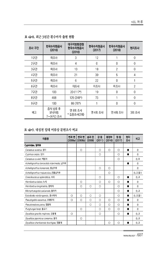 viii. 어 류 www.nie.re.kr ?607 조사 구간 한국수자원공사 2016 대구지방환경청 한국수자원공사 2016 한국수자원공사 2017 한국수자원공사 2018 현지조사 1구간 미조사 3 12 1 0 2구간 미조사 4 0 0 0 3구간 미조사 13 18 2 0 4구간 미조사 21 39 5 4 5구간 미조사 6 22 0 1 6구간 미조사 미조사 미조사 미조사 2 7구간 103 20 117* 19 0 0 8구간 468 125 248* 73 1 0 9구간 100 86 70* 1 0 0 비고 증식 방류 후 모니터링 7∼9구간 조사 연 8회 조사 * 집중조사 2회 연 4회 조사 연 4회 조사 3회 조사 표 ⅷ-8. 최근 3년간 흰수마자 출현 현황 어종명 변과 변 2008a 변과 변 2008b 송과 전 200...