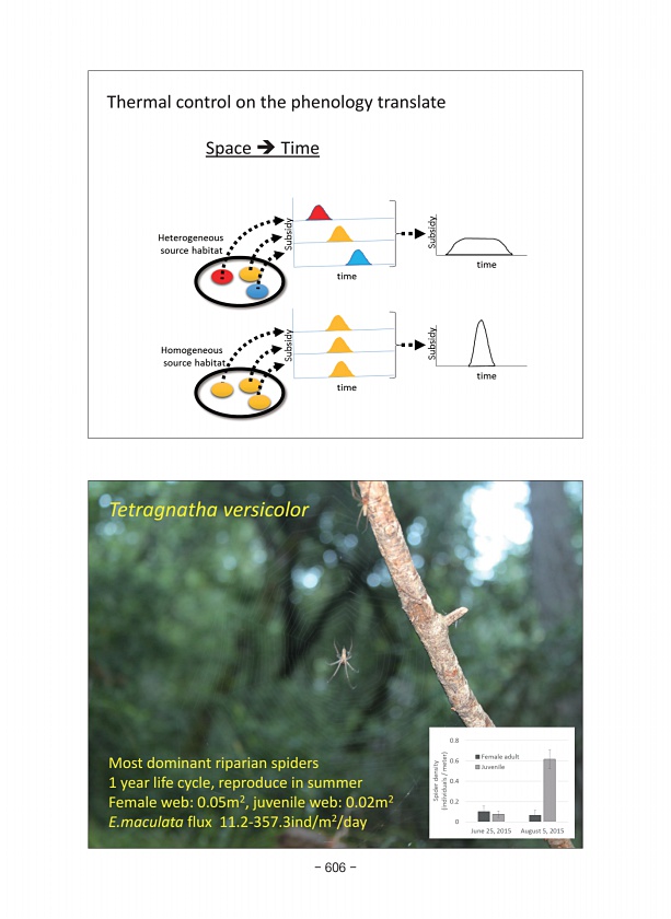 Most dominant riparian spiders 1 year life cycle, reproduce in summer Female web0.05m2, juvenile web0.02m2 E.maculata flux 11.2-357.3ind/m2/day Tetragnatha versicolor Thermal control on the phenology translate Space ? Time 606