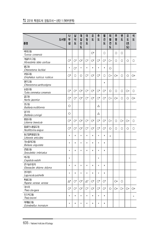 2018 특정도서 정밀조사 신안 1 북부권역 606 ? National Institute of Ecology 도서명 종명 나 무 섬 납 작 도 대 길 산 도 대 청 도 오 도 추 도 횡 견 도 외 횡 견 도 무 명 도 변 도 오 도 조 도 석 도 바위고둥 Turcica coreensis ○* ○ ○ ○ 개울타리고둥 Monodonta labio confusa ○* ○* ○* ○* ○* ○* ○* ○+ ○ ○ ○ ○ 밤고둥 Chlorostoma lischkei * ○* * * * * * ○ 보말고둥 Omphalius rusticus rusticus ○* ○ ○ ○* ○* ○* ○ ○+ ○+ ○ ○ ○+ 명주고둥 Chlorostoma xanthostigma * 눈알고둥 Turbo coronatus coreensi...