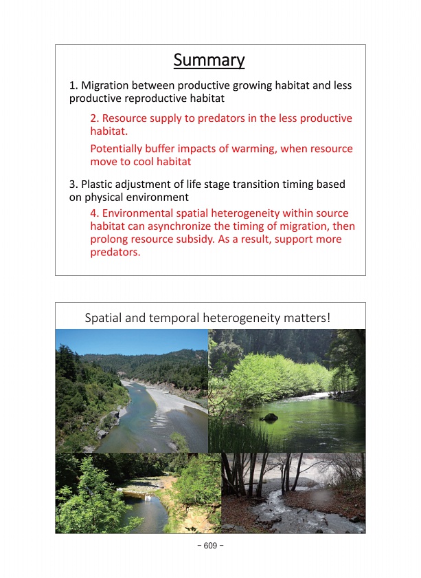 Spatial and temporal heterogeneity matters! Summary 1. Migration between productive growing habitat and less productive reproductive habitat 3. Plastic adjustment of life stage transition timing based on physical environment 2. Resource supply to predators in the less productive habitat. Potentially buffer impacts of warming, when resource move to cool habitat 4. Environmental spatial heterogeneit...