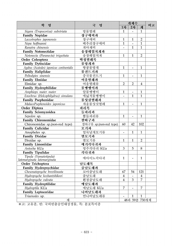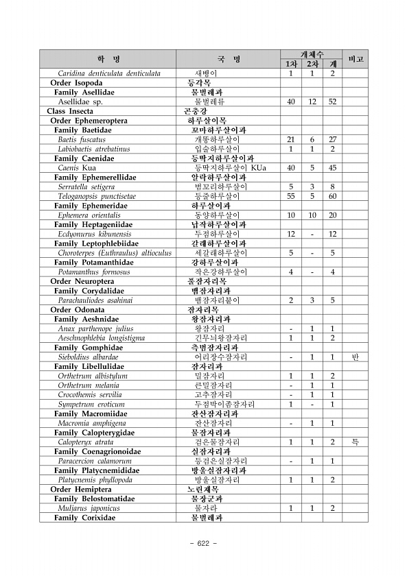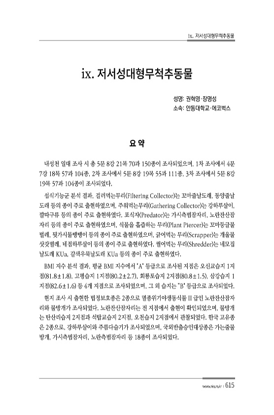 ix. 저서성대형무척추동물 www.nie.re.kr ?615 ix. 성명권혁영·장명성 소속안동대학교·에코벅스 내성천 일대 조사 시 총 5문 8강 21목 70과 150종이 조사되었으며, 1차 조사에서 4문 7강 18목 57과 104종, 2차 조사에서 5문 8강 19목 55과 111종, 3차 조사에서 5문 8강 19목 57과 104종이 조사되었다. 섭식기능군 분석 결과, 걸러먹는무리 Filtering Collector 는 꼬마줄날도래, 동양줄날 도래 등의 종이 주로 출현하였으며, 주워먹는무리 Gathering Collector 는 강하루살이, 깔따구류 등의 종이 주로 출현하였다. 포식자 Predator 는 가시측범잠자리, 노란잔산잠 자리 등의 종이 주로 출현하였으며, 식물을 흡즙하는 무리 Plant Pierce...