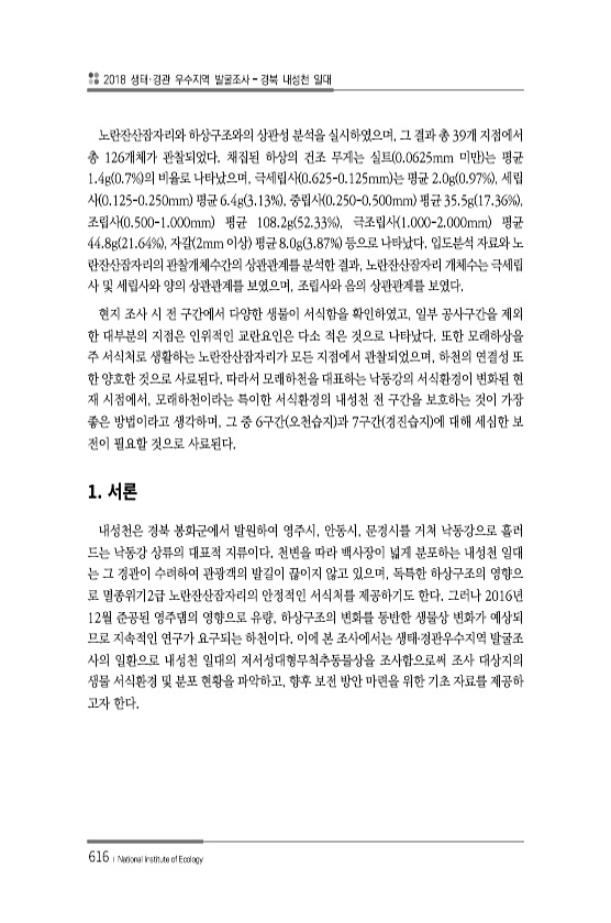 2018 생태·경관 우수지역 발굴조사 경북 내성천 일대 616 ? National Institute of Ecology 노란잔산잠자리와 하상구조와의 상관성 분석을 실시하였으며, 그 결과 총 39개 지점에서 총 126개체가 관찰되었다. 채집된 하상의 건조 무게는 실트 0.0625mm 미만 는 평균 1.4g 0.7% 의 비율로 나타났으며, 극세립사 0.625-0.125mm 는 평균 2.0g 0.97% , 세립 사 0.125-0.250mm 평균 6.4g 3.13% , 중립사 0.250-0.500mm 평균 35.5g 17.36% , 조립사 0.500-1.000mm 평균 108.2g 52.33% , 극조립사 1.000-2.000mm 평균 44.8g 21.64% , 자갈 2mm 이상 평균 8.0g 3.87% 등으로 나...