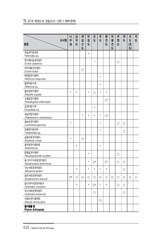 2018 특정도서 정밀조사 신안 1 북부권역 610 ? National Institute of Ecology 도서명 종명 나 무 섬 납 작 도 대 길 산 도 대 청 도 오 도 추 도 횡 견 도 외 횡 견 도 무 명 도 변 도 오 도 조 도 석 도 비늘갯지렁이류 Polinoidae sp. * 민수염비늘갯지렁이 Eunoe yedoensis * ○ 자주색털갯지렁이 Eunice indica ○ 바위털갯지렁이 Marphysa sanguinea * 털갯지렁이류 Marphysa sp. * 털보집갯지렁이 Diopatra sugokai * * * ○ * * 수염집갯지렁이 Protodiopatra willemoesii ○* 집갯지렁이류 Onuphidae sp. * 새날개갯지렁이 Chaetopterus variopedatus ...