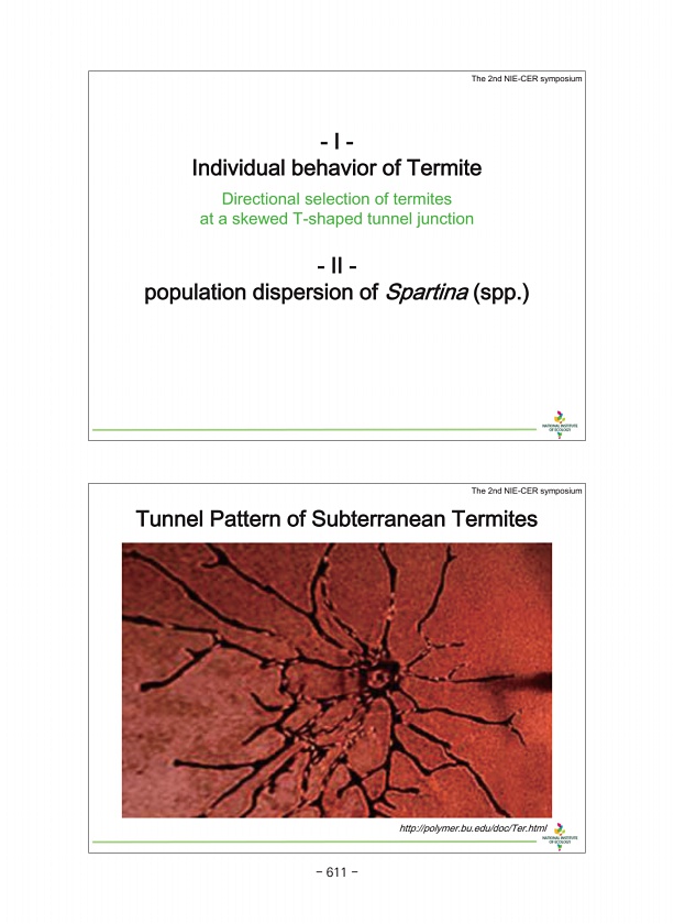 Tunnel Pattern of Subterranean Termites http//polymer.bu.edu/doc/Ter.html The 2nd NIE-CER symposium Ⅰ Individual behavior of Termite Directional selection of termites at a skewed T-shaped tunnel junction Ⅱ population dispersion of Spartina spp. The 2nd NIE-CER symposium 611