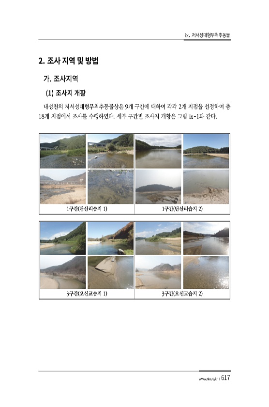 ix. 저서성대형무척추동물 www.nie.re.kr ?617 2. 1 내성천의 저서성대형무척추동물상은 9개 구간에 대하여 각각 2개 지점을 선정하여 총 18개 지점에서 조사를 수행하였다. 세부 구간별 조사지 개황은 그림 ⅸ-1과 같다. 1구간 탄산리습지 1 1구간 탄산리습지 2 3구간 오신교습지 1 3구간 오신교습지 2