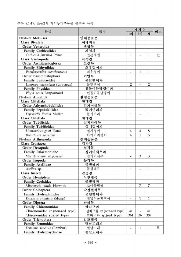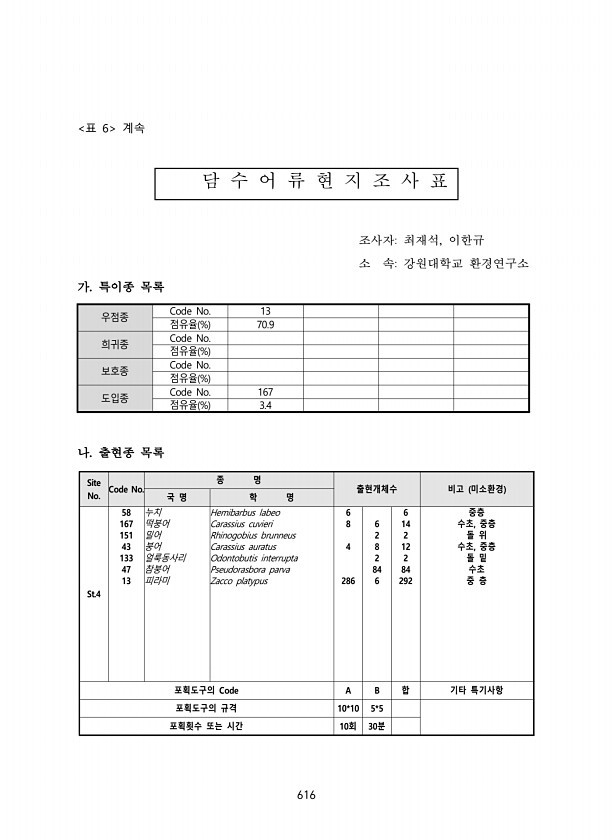 616 표 6 계속 담 수 어 류 현 지 조 사 표 조사자최재석, 이한규 소 속강원대학교 환경연구소 가. 특이종 목록 우점종 Code No. 13 점유율 % 70.9 희귀종 Code No. 점유율 % 보호종 Code No. 점유율 % 도입종 Code No. 167 점유율 % 3.4 나. 출현종 목록 Site No. Code No. 종 명 출현개체수 비고 미소환경 국 명 학 명 St.4 58 누치 Hemibarbus labeo 6 6 중층 167 떡붕어 Carassius cuvieri 8 6 14 수초, 중층 151 밀어 Rhinogobius brunneus 2 2 돌 위 43 붕어 Carassius auratus 4 8 12 수초, 중층 133 얼룩동사리 Odontobutis interrupta 2 2 돌 ...