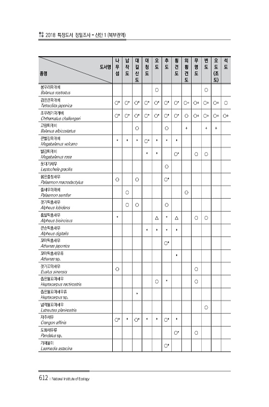 2018 특정도서 정밀조사 신안 1 북부권역 612 ? National Institute of Ecology 도서명 종명 나 무 섬 납 작 도 대 길 산 도 대 청 도 오 도 추 도 횡 견 도 외 횡 견 도 무 명 도 변 도 오 도 조 도 석 도 봉우리따개비 Balanus rostratus ○ ○ 검은큰따개비 Tetracliita japonica ○* ○* ○* ○* ○* ○* ○* ○+ ○+ ○+ ○+ ○ 조무래기따개비 Chthamalus challengeri ○* ○* ○* ○* ○* ○* ○* ○ ○+ ○+ ○+ ○+ 고랑따개비 Balanus albicostatus ○ ○ + + + 큰빨강따개비 Megabalanus volcano * * * ○* * * * 빨강따개비 Megabalanus rosa * ...