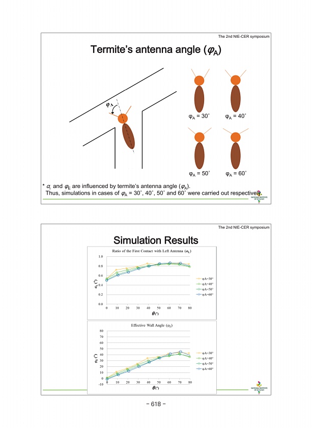 Simulation Results The 2nd NIE-CER symposium θ θ Termite’s antenna angle φA φA = 30˚ φA = 40˚ φA = 50˚ φA = 60˚ * αi and φE are influenced by termite’s antenna angle φA Thus, simulations in cases of φA = 30˚, 40˚, 50˚ and 60˚ were carried out respectively. The 2nd NIE-CER symposium 618