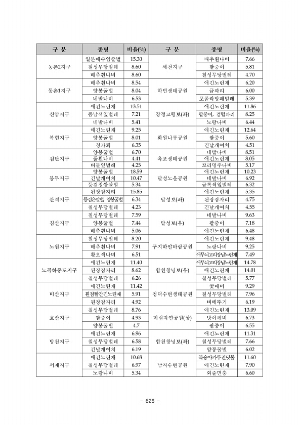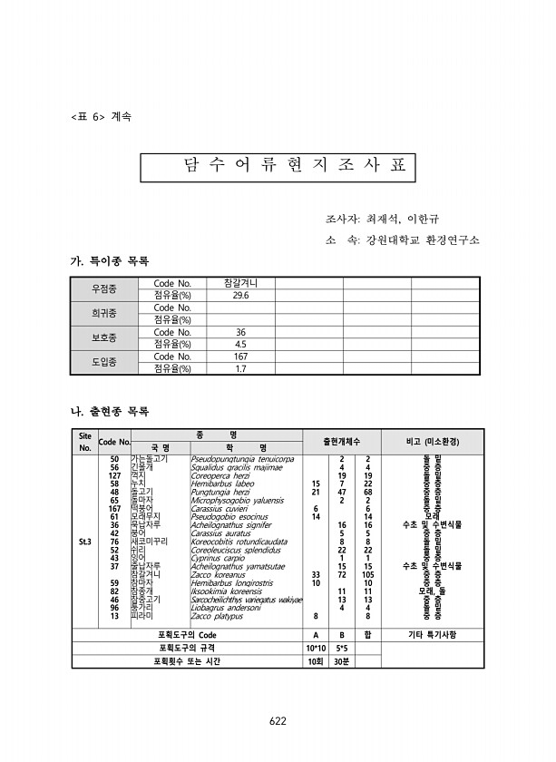 622 표 6 계속 담 수 어 류 현 지 조 사 표 조사자최재석, 이한규 소 속강원대학교 환경연구소 가. 특이종 목록 우점종 Code No. 참갈겨니 점유율 % 29.6 희귀종 Code No. 점유율 % 보호종 Code No. 36 점유율 % 4.5 도입종 Code No. 167 점유율 % 1.7 나. 출현종 목록 Site No. Code No. 종 명 출현개체수 비고 미소환경 국 명 학 명 St.3 50 가는돌고기 Pseudopungtungia tenuicorpa 2 2 돌 밑 56 긴몰개 Squalidus gracilis majimae 4 4 중 층 127 꺽지 Coreoperca herzi 19 19 돌 밑 58 누치 Hemibarbus labeo 15 7 22 중 층 48 돌고기 Pungtungia ...