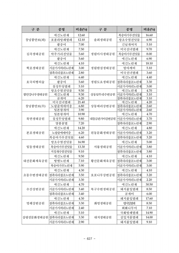624 표 6 계속 담 수 어 류 현 지 조 사 표 조사자최재석, 이한규 소 속강원대학교 환경연구소 가. 특이종 목록 우점종 Code No. 참갈겨니 점유율 % 23.6 희귀종 Code No. 점유율 % 보호종 Code No. 36 70 점유율 % 7.3 1.4 도입종 Code No. 점유율 % 나. 출현종 목록 Site No. Code No. 종 명 출현개체수 비고 미소환경 국 명 학 명 St.5 127 꺽지 Coreoperca herzi 9 9 돌 밑 대륙종개 Orthrias nudus 3 3 돌 밑 48 돌고기 Pungtungia herzi 21 21 중층 65 돌마자 Microphysogobio yaluensis 3 11 14 돌 밑 70 돌상어 Gobiobotia brevibarba 3 3 돌 밑 ...